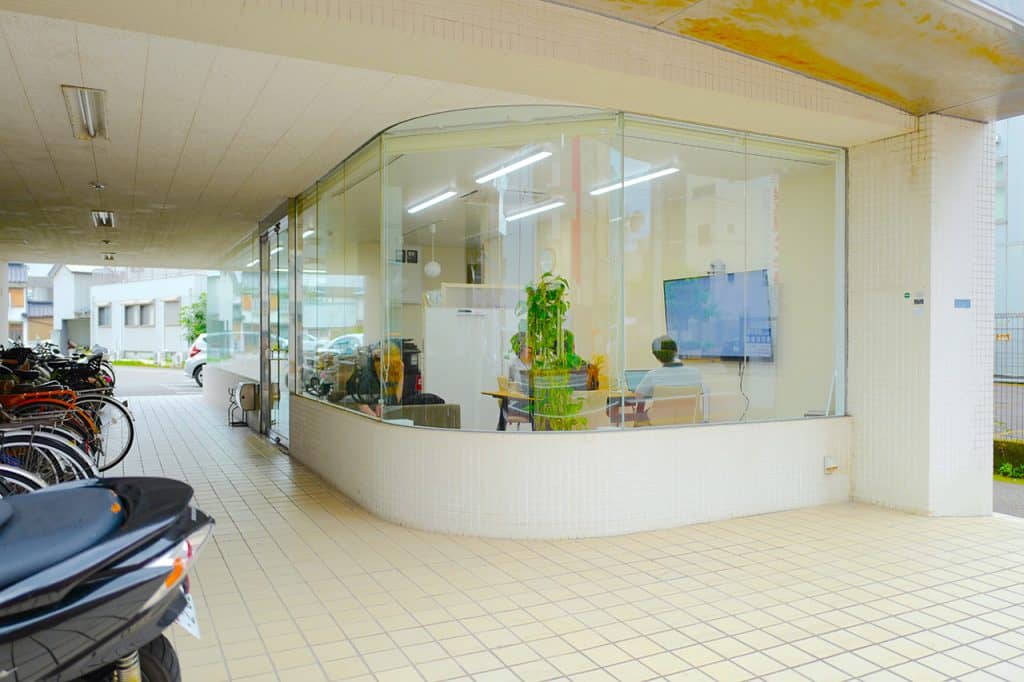 主要道路沿いにあるため場所もわかりやすく、正面は元喫茶店らしい、ガラス張りが素敵な外観。