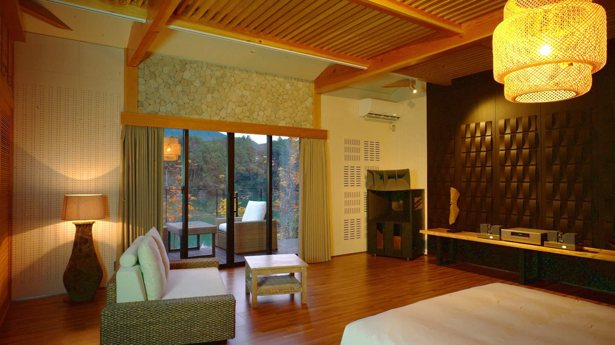 実際に音楽をかけてもらったのですが、本当に「音を見る」ことができているような感動的な体験をすることができ、リピーターの方が多い理由がわかりました。さらに目の前に広がるのはずっと眺めていたい、穏やかな川の風景。リラックスした状態で自然を身近に感じられる空間が他になくとても贅沢なんだと感じました。今年オープンしたお部屋の壁紙になっているのは音響効果にこだわり抜いた土佐和紙だということで、驚きの連続です。