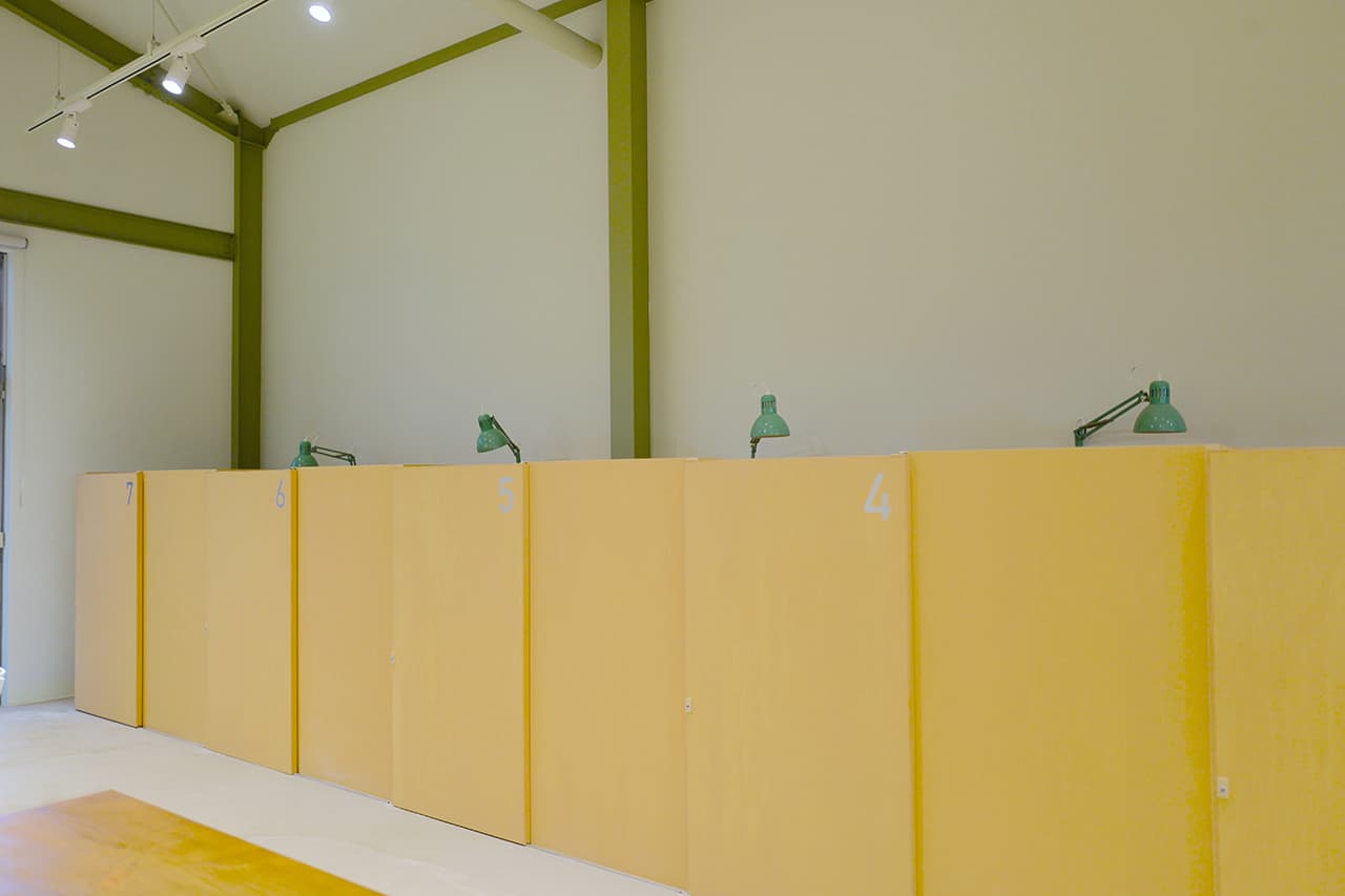 柱などの塗装部分も、黒板工場の雰囲気を引き継いで、黒板らしい淡い緑色なっているそうです。