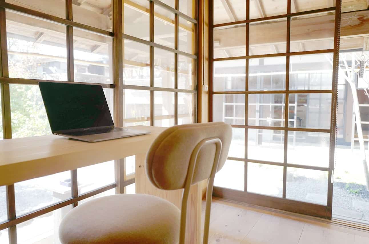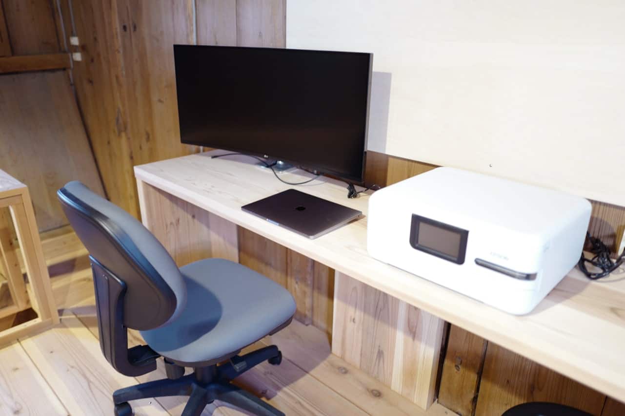 かつて建材メーカーで働いており建築や造園が好きだったご主人の生家を、お二人で少しずつ手入れをしながら営業をしてきたそう。ワーケーションでの利用もしやすいようにと、Wi-Fiやデスク、モニターやプリンターも導入されました。長期滞在にもオススメです。