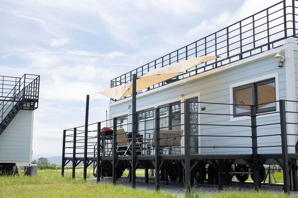 2021年7月にお庭に登場したのは手軽にバーベキューが楽しめるグランピングプラン「NEST GLAMPING PLACE “nokka”」。なんと屋上に上がれてしまう珍しいモバイルハウス、2棟が新設されました。