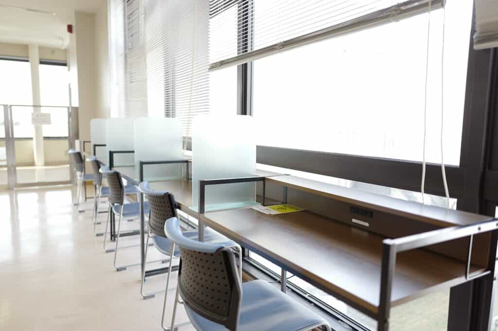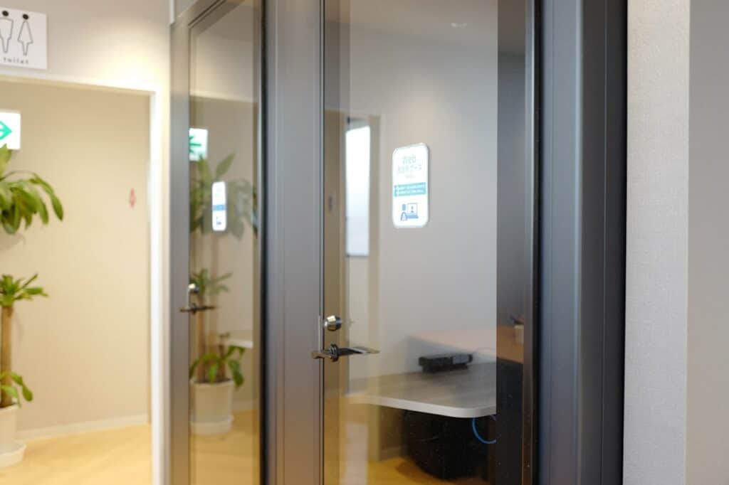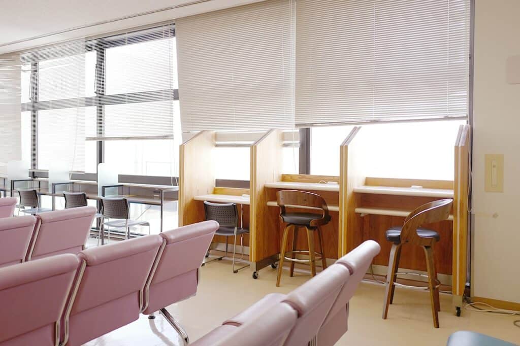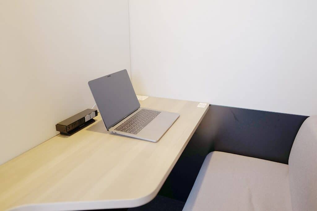 セキュリティー面が気になるビジネス需要にも応え、背後が気にならない半個室席や、ウェブ会議も可能な個室ブースも2機導入。ブースは受付で利用時間の予約が可能なので、決まった時間のオンライン会議対応も可能です。