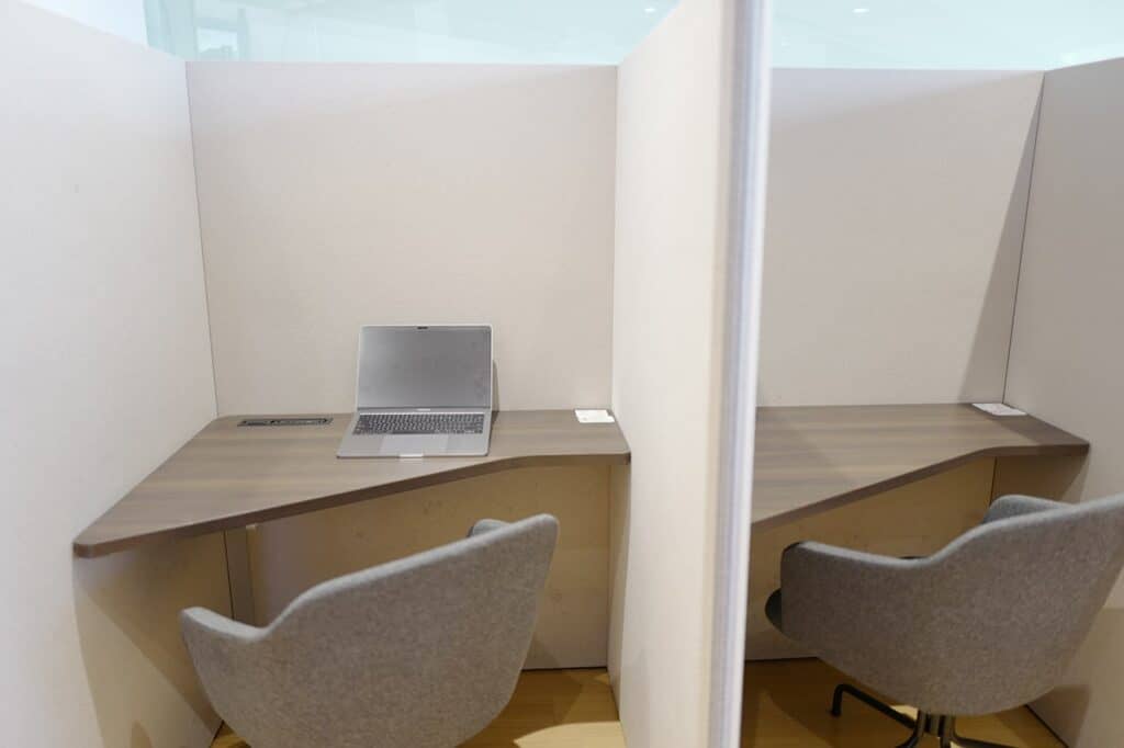 「企画にあたり、さまざまな規模の空港ラウンジも参考に何度も視察をしましたね。十分に広いとは言えないが、ビジネス利用のお客様のセキュリティー面のことも考え、セパレートのブースタイプにこだわりました。結果的に、隣接して座席を用意することができたため、課題点であった席数の確保にも繋がりました」