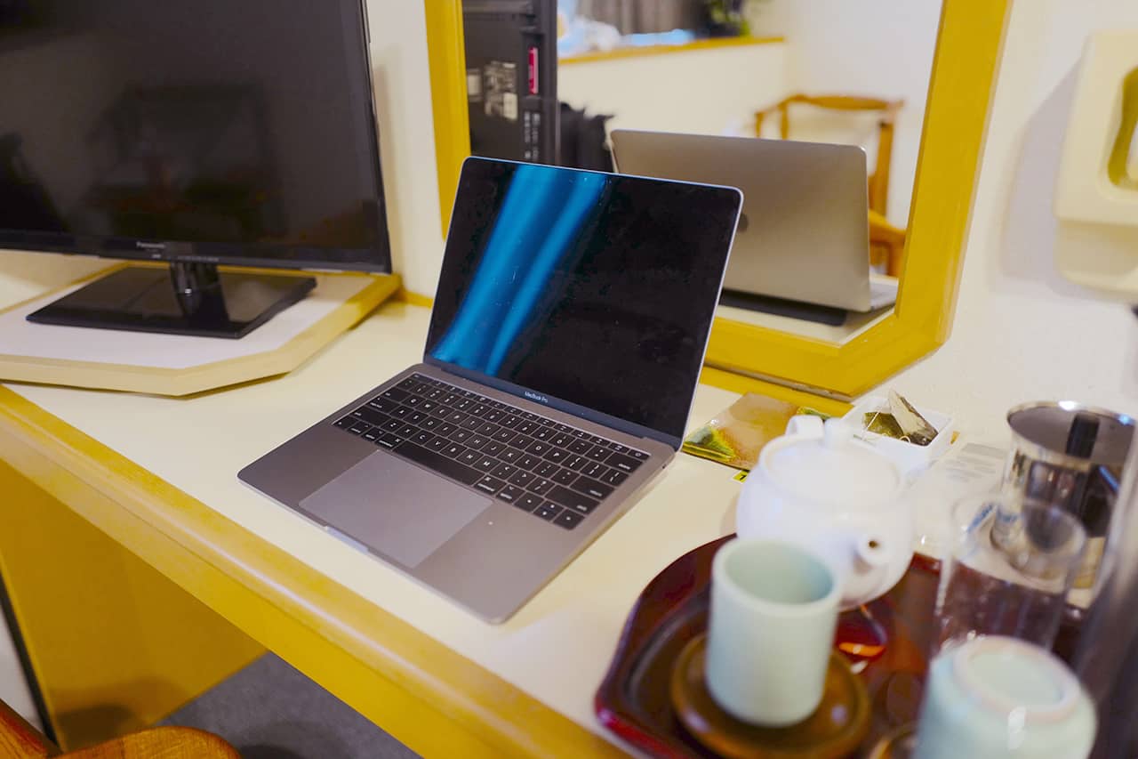 「ご宿泊のお部屋だけでなく、気分を変えたい時などにどうぞ。山々や四万十川が存分に見えるこのロケーションでもぜひお仕事をしてください。コンセントは床に何箇所かあります。ドリンクの注文もできますよ」