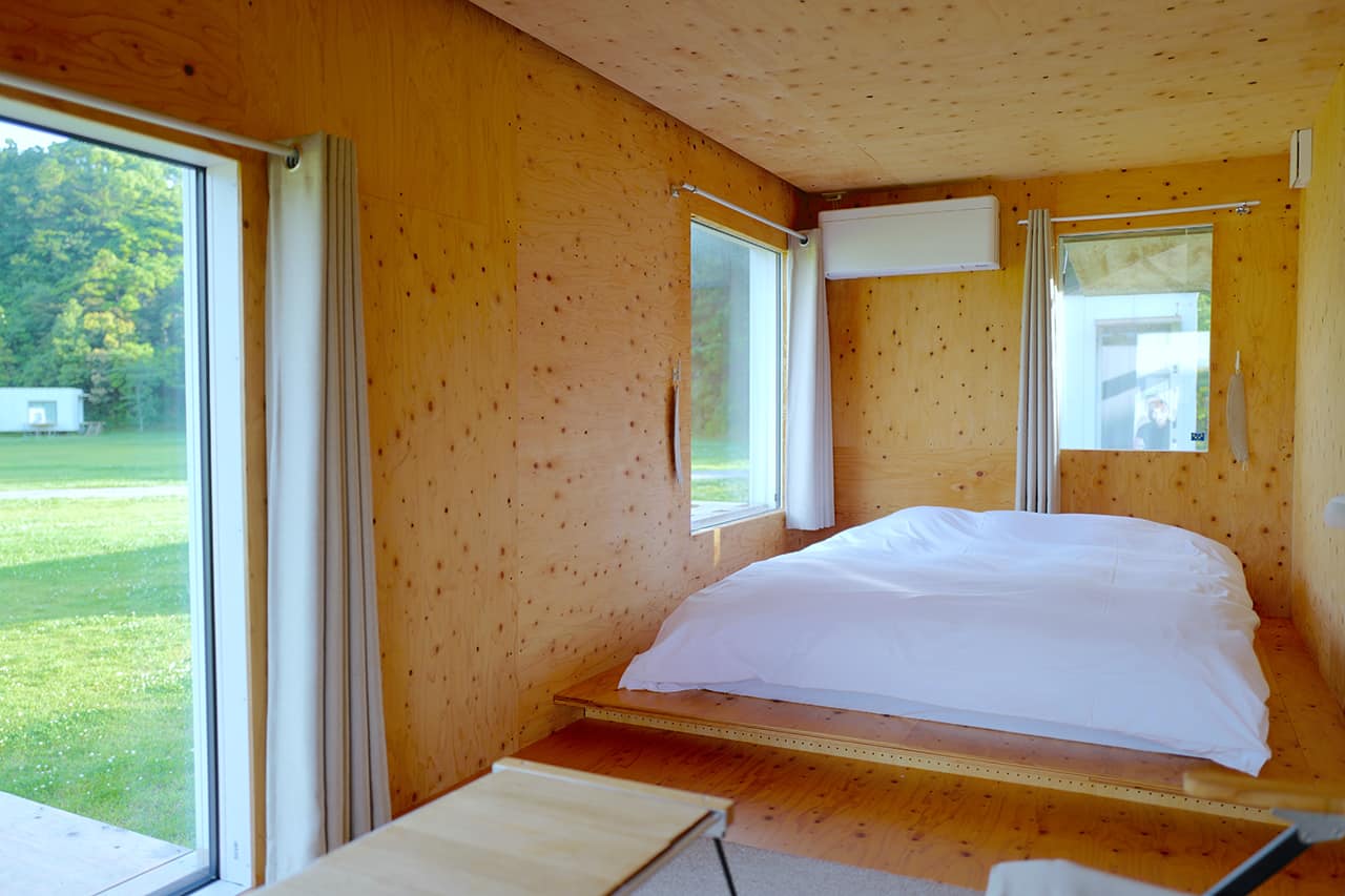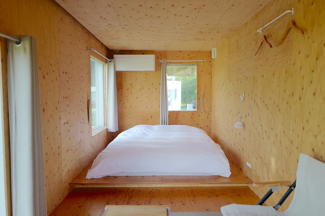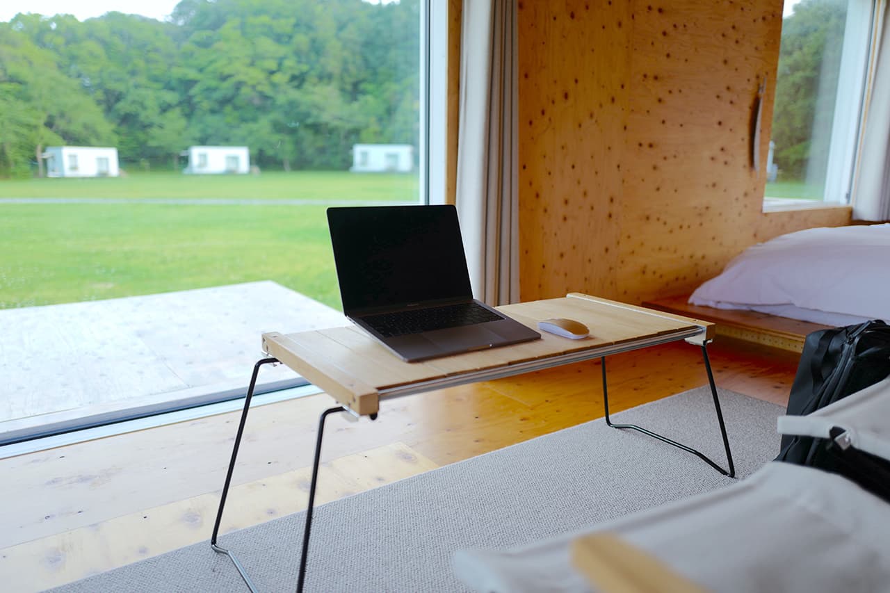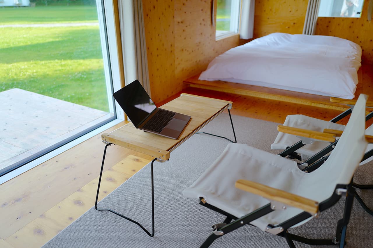 キャンプサイトはもちろんのこと、話題のモバイルハウスに泊まることができます。日本を代表する建築家、隈研吾氏が設計したコンテナのような住居空間「住箱」は、ベッドやエアコン、電源とWi-Fiも備わっているのでパソコンを持ち込んでのお仕事も可能。テント泊とはまた違った楽しさがあり、こちらへ宿泊すれば快適なワークが可能となります。