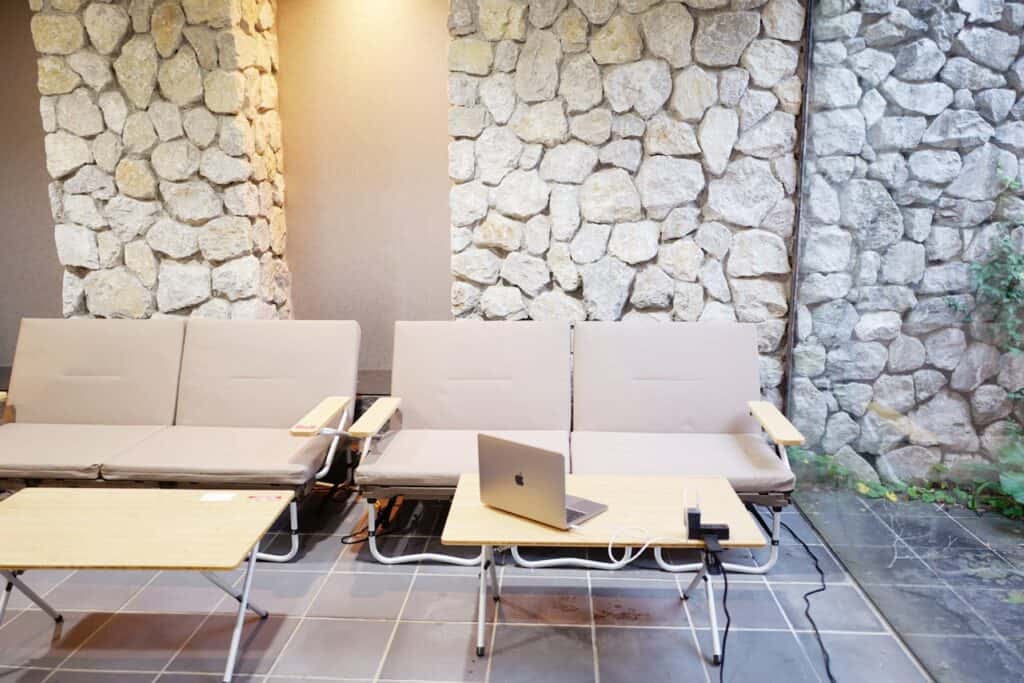 メインのコワーキング専用スペースは2箇所で、SnowPeakのソファやテーブルが備えられているスペースは大きな窓もあり開放的。和室もあり、休憩時には電子レンジや湯沸かしケトルも利用できます。飲食は申請時に申告すれば可能です(ゴミはお持ち帰りください)。
